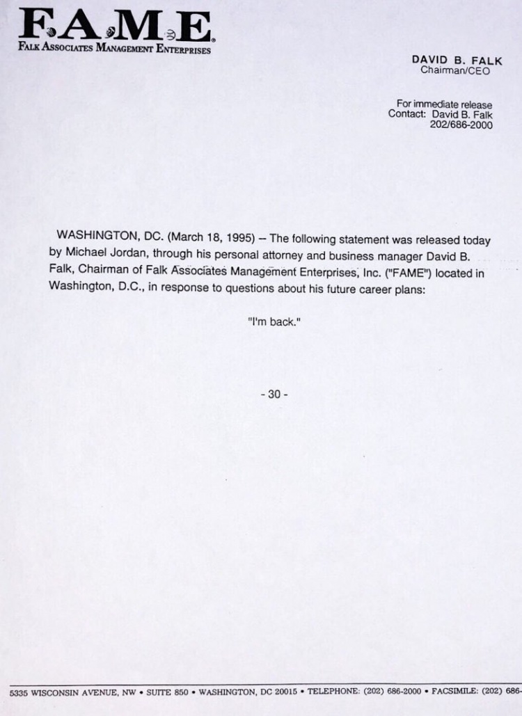 30年前即1995年的今天,迈克尔-乔丹宣布复出。这是他生涯的第一次复出。乔丹的复出声明言简意赅,只有“我回来了(I'm back.)”一句话,这句话也被广大球迷奉为经典。