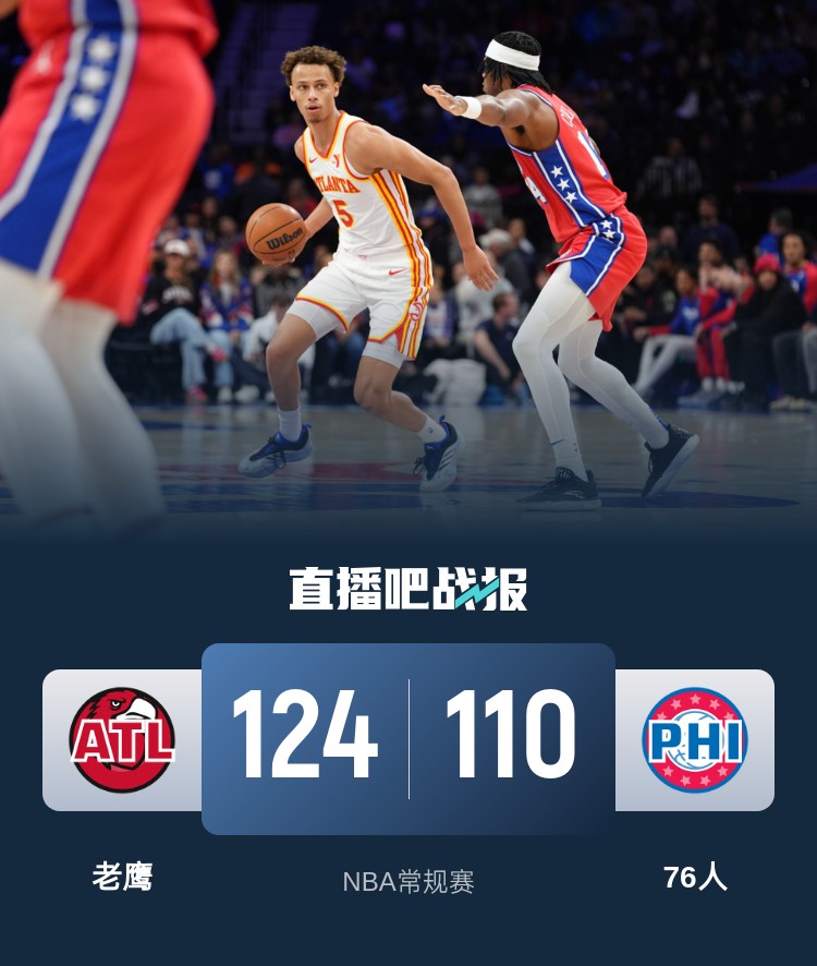 上半场,两队展开对攻,特雷-杨得分助攻一肩挑,巴特勒高效输出还以颜色,双方比分紧咬,次节双方继续缠斗,博纳联手巴特勒持续发力帮助76人占据主动,勒韦尔手感火热顽强咬住,半场战罢76人66-60领先老鹰。下半场,76人命中率骤降,老鹰多点开花,连中三分完成反超,末节老鹰持续发力,特雷-杨连中三分一度将分差拉开到18分,76人苦苦追赶无果。最终,老鹰124-110击败76人,客场过关。