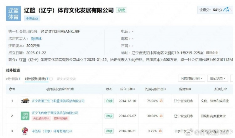 此前,辽宁男篮的注册主体辽宁沈阳三生飞豹篮球俱乐部(以下简称“辽篮飞豹”)由辽篮(沈阳)体育文化有限公司100%持股,而辽篮(沈阳)体育文化有限公司(简称“辽篮(沈阳)体育”)此前由刘子庆持股80%,张建华占股20%。近日,辽篮(沈阳)体育已将所有持有的辽篮100%股权全部质押给银行,此举被外界认为辽篮(沈阳)体育的资金链非常紧张。