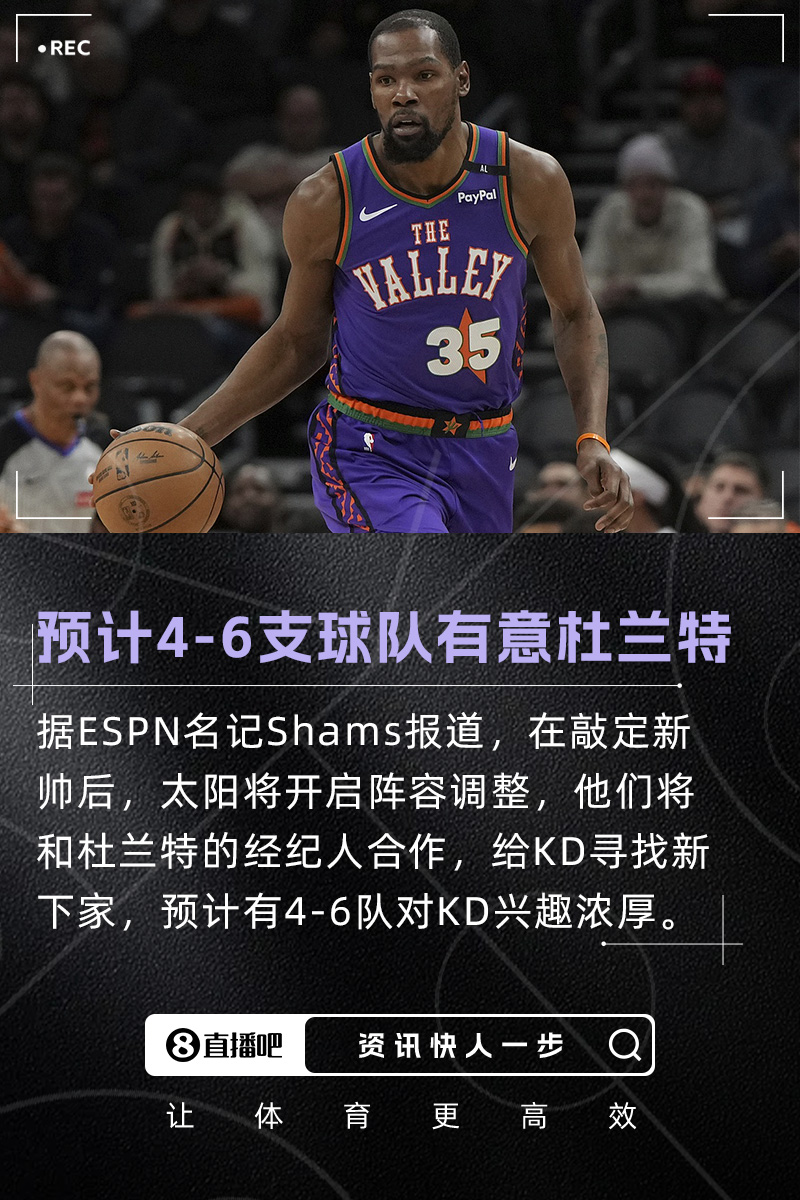 数位消息人士表示,今年休赛期,预计今年休赛期杜兰特会有强劲的市场,将有约4到6支球队对交易得到他有浓厚的兴趣。