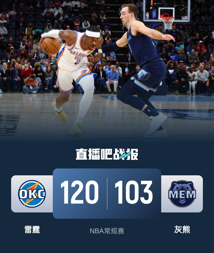 比赛上来,两队就打得十分胶着,雷霆虽然有拉开分差的势头,但灰熊在首节末段还是追了回来,次节雷霆一直保持着场上的微弱领先,不过顽强的灰熊始终没有给他们扩大优势的机会,半场结束时雷霆领先6分;下半场回来,灰熊还是落入下风,雷霆连续第三个单节拿到30+,分差也是终于达到两位数,末节灰熊一波7-0迫近比分,但雷霆立马连拿九分给出回应,之后比赛也没有再生波澜,最终雷霆轻取灰熊,迎来五连胜的同时也送给后者四连败。