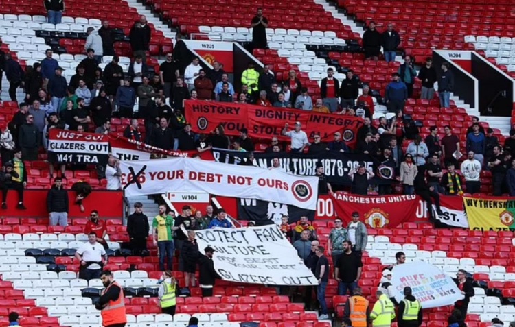 曼联球迷组织1958组织了这场抗议活动,数百人在比赛结束后仍留在座位上。曼联季票将连续第三年上涨5%左右,球迷们在工作人员的注视下,唱着反格雷泽的歌曲。一名球迷似乎被一名安保推了出去,并被一些服务员制服,其中一名安保似乎还搂住了这名男子的脖子。