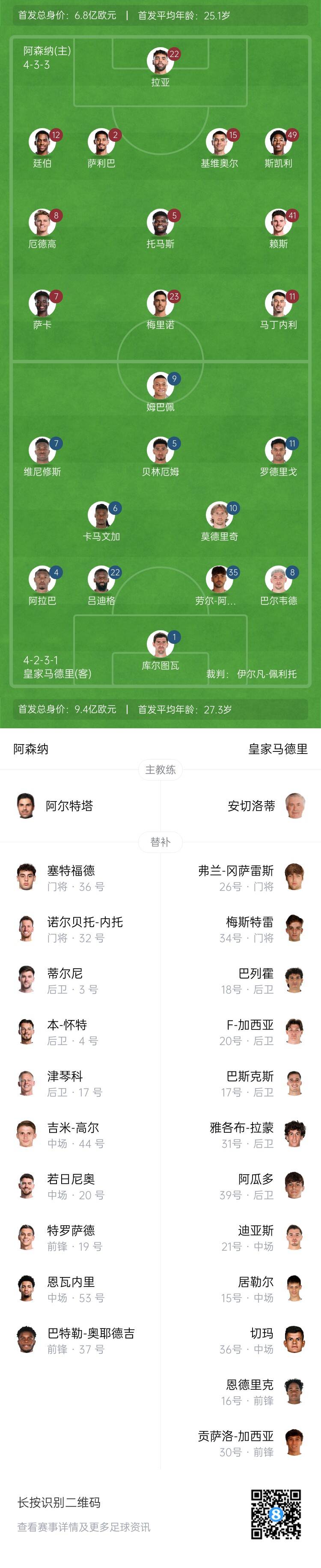 皇马替补:26-弗兰-冈萨雷斯、20-弗兰-加西亚、34-梅斯特雷、21-迪亚斯、15-居勒尔、30-贡萨洛、16-恩德里克、31-雅各布-拉蒙、17-巴斯克斯、36-切玛、18-巴列霍、39-洛伦佐