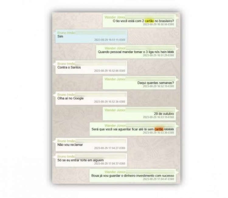 巴西媒体从警方获得了球员涉赌的聊天记录,这些人于去年11月被警方扣押并没收了手机。记录显示,布鲁诺-恩里克涉嫌在2023年巴西杯弗拉门戈对桑托斯的比赛中故意吃黄牌,使相关投注者获益。