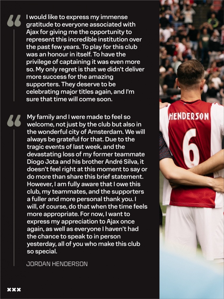 “我的家人和我受到的欢迎,不仅来自俱乐部,还有美丽的阿姆斯特丹市,我们对此将永远心存感激。由于上周的发生的事件,以及我前队友若塔及其兄弟安德烈的令人痛心的去世,此刻除了发表这份简短的声明之外,我似乎不适合再多说或多做些什么。然而我很清楚,我欠这家俱乐部、我的队友和球迷们一份更完整、更个人化的感谢。当然,我会在更合适的时机表达这份谢意。现在,我想再次向阿贾克斯以及昨天我未能亲自交谈的所有人表达我的感激之情,是你们让这家俱乐部如此特别。”