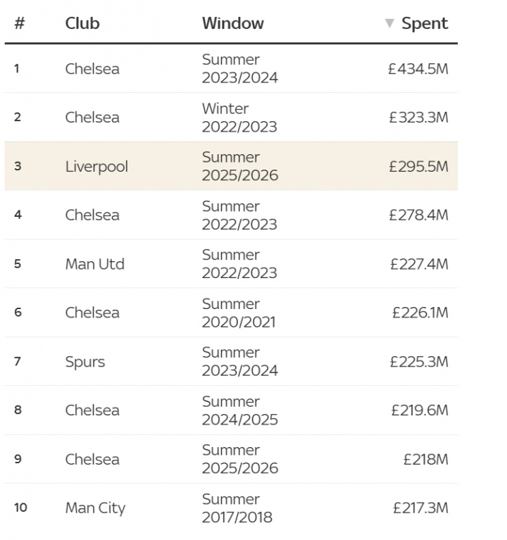 还有高手❓利物浦花2.95亿镑“仅”排历史第三,切尔西4.34亿居首