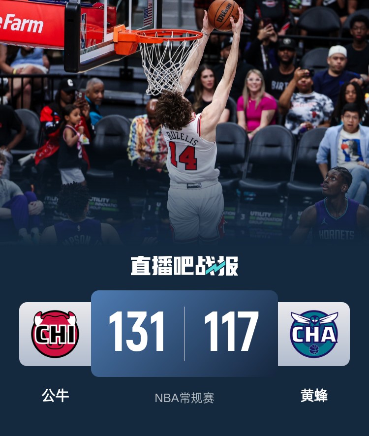 上半场,黄蜂率先发力打出17-6的开局,公牛连中三分回敬13-0的攻击波,此后双方陷入缠斗,比分始终紧咬,怀特突然发力,连续三分命中单节砍下18分,半场战罢公牛75-55领先黄蜂。下半场,黄蜂打出10-2迫近比分,又是怀特内外开花拿分稳住局势,末节公牛持续发力扩大领先,黄蜂苦苦追赶无果。最终,公牛131-117击败黄蜂,客场过关。