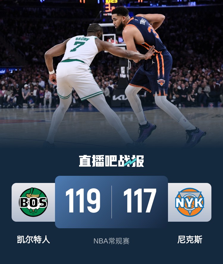 比赛开始,唐斯率先发力,内外开花高效拿分,塔图姆里突外投迅速回应,次节尼克斯持续发力将分差拉开到两位数,唐斯延续火力,但怀特和塔图姆联手带队迅速追赶,半场战罢尼克斯58-52领先凯尔特人。易边再战,双方继续缠斗,尼克斯稳扎稳打,波尔津吉斯连中三分强势回应,末节尼克斯持续发力反超比分,塔图姆三分追平,哈特三分绝杀不中,双方进入加时。加时赛,两队依旧打得难解难分,关键时刻波尔津吉斯命中三分,尼克斯致命失误。最终,绿军加时119-117力克尼克斯。