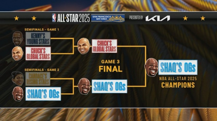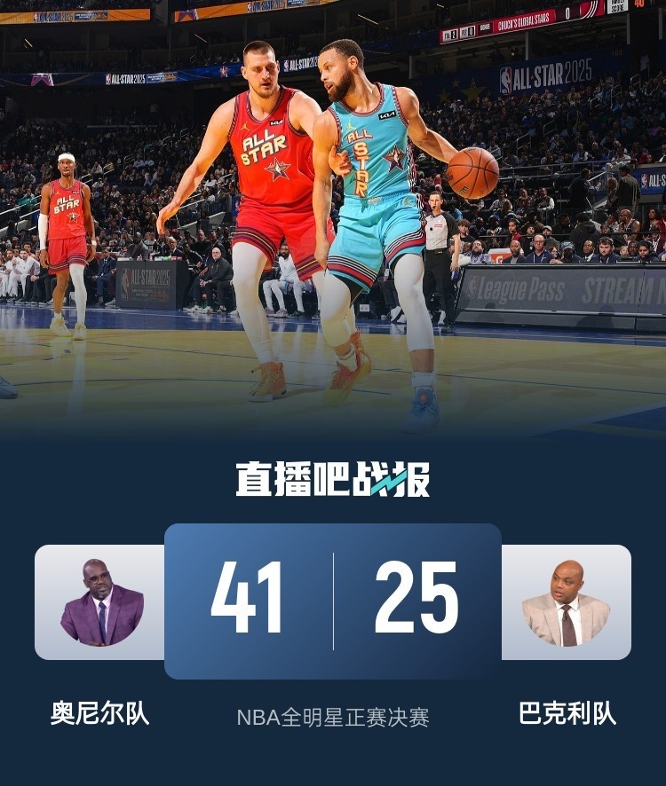 比赛开始,库里骑马射箭抛进三分为奥尼尔队开局,而巴克利队连续6次出手三分都不中,反观塔图姆连续三分连砍8分打出11-0开局,亚历山大罚球为巴克利队拿到首分。暂停期间进行全明星交接仪式和致敬TNT解说天团,文班亚马命中首记三分,但欧文联手杰伦-布朗能帮助球队守住10分左右领先,随后库里连续三分拿到赛点,塔图姆空切扣空篮杀死比赛,最终奥尼尔队41-25战胜巴克利队,拿到冠军!