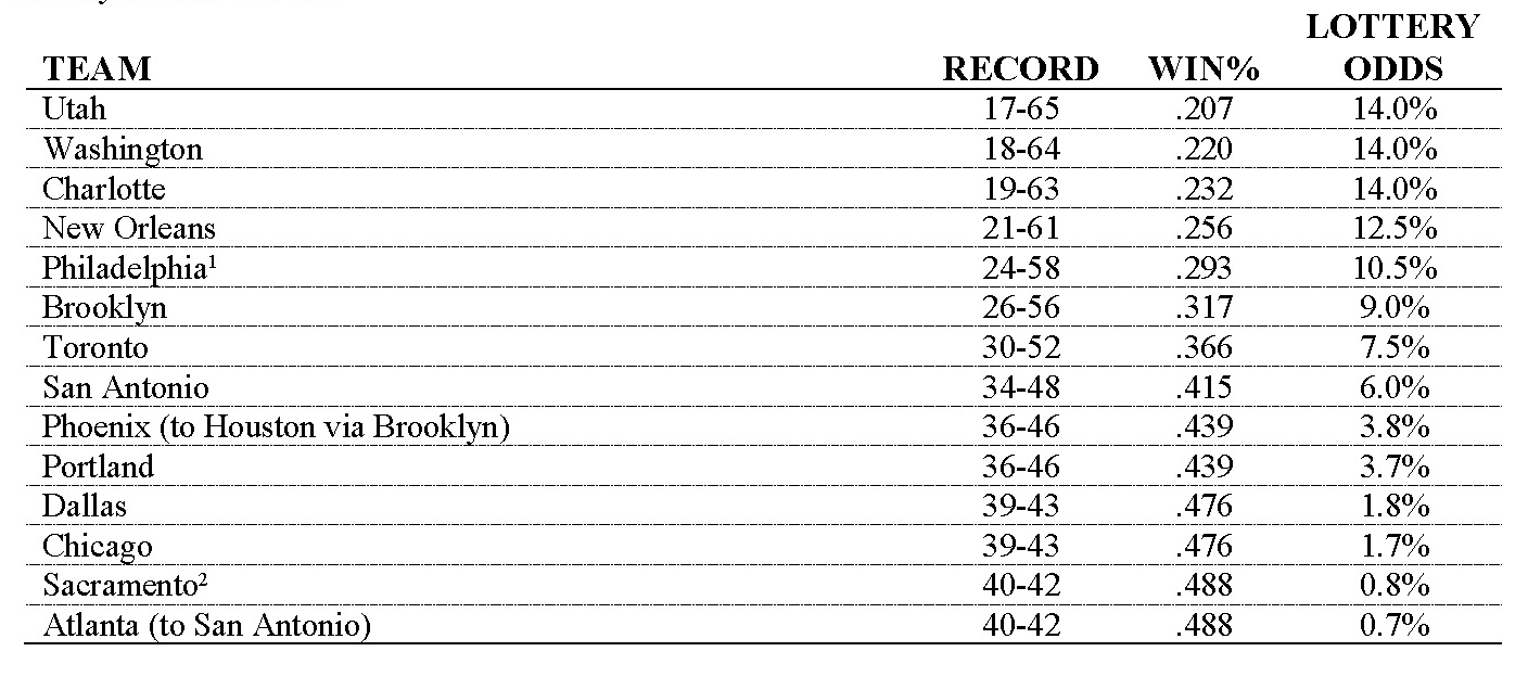 按照联盟的规定,无缘本赛季季后赛的球队可以参加乐透抽签大会,因此参加今年这届盛事的有14支队伍,分别是爵士、奇才、黄蜂、鹈鹕、76人、篮网、猛龙、马刺、太阳、开拓者、独行侠、公牛、国王、老鹰。