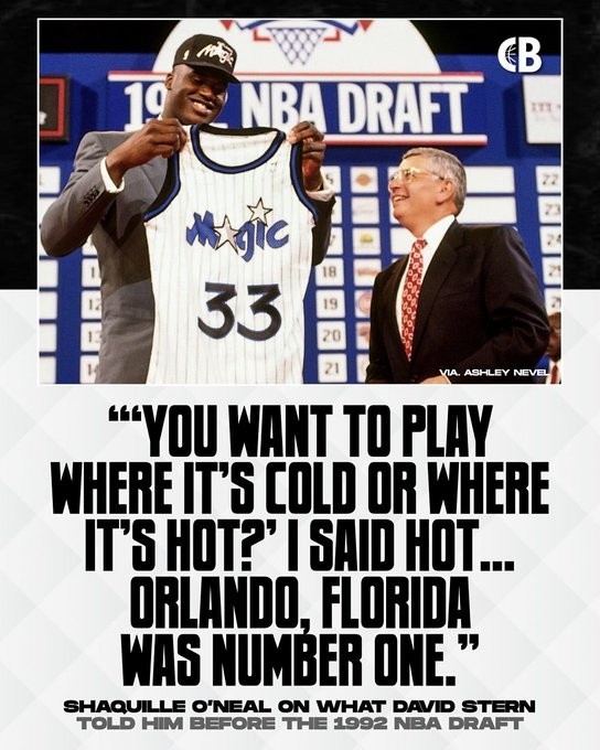 奥尼尔说:“我在选秀前的三月份遇到了斯特恩先生,他对我说,‘嘿,我知道你是谁,迫不及待地想让你进入NBA了。’然后他把我拉到一边问道,‘你是想在天气寒冷的地方打球,还是在天气炎热的地方打球呢?’”