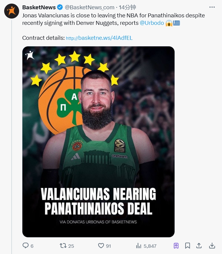 据报道,帕纳辛纳科斯给瓦兰开出了3年1200万欧元的合同。而瓦兰现有的NBA合同仅有25-26赛季是保障合同,金额为1040万美元,26-27赛季是非保障合同(薪资1000万美元)。