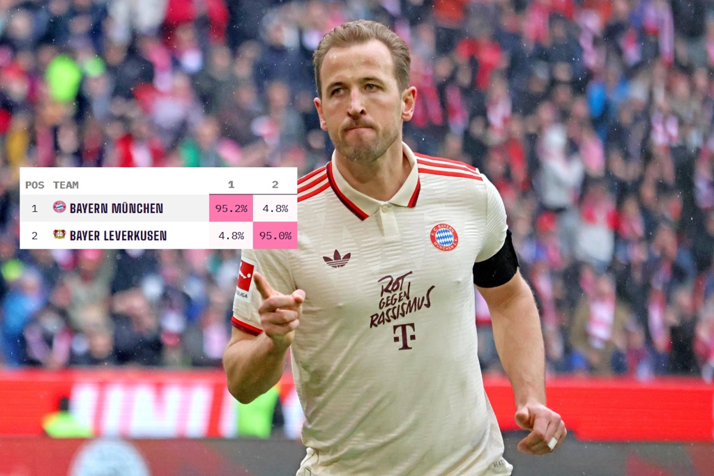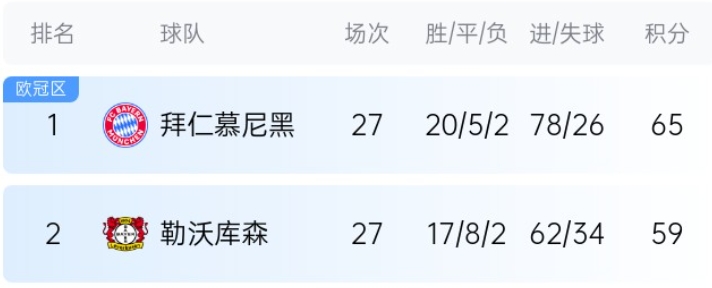 目前拜仁27轮积65分,领先积59分的勒沃库森6分。数据机构Opta的最新预测结果显示,尽管拜仁近3轮只取得1胜,但他们的德甲夺冠概率仍高达95.2%,是争冠对手勒沃库森的近20倍。