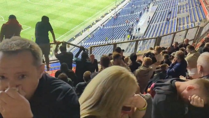 视频背景中可以听到咳嗽声,其他社交媒体用户也证实大量球迷受到影响。后续画面显示,球迷们揉着眼睛、掩面发出嘘声。据社交媒体爆料,警方在封锁洗手间和走廊前曾告知球迷需滞留一小时但可自由使用设施,随后却举起防暴盾并喷洒催泪瓦斯。