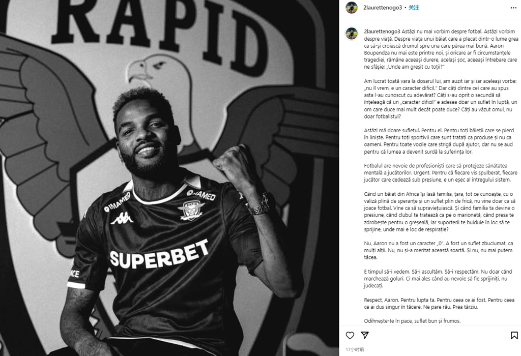 FIFA经纪人、去年帮助布彭扎转会加勒斯特快速的Laurette Nogo长文讲述悲剧之后的原因,她直言,当俱乐部把你当成傀儡,媒体因错误将你碾碎,球迷嘘声取代支持时,还有呼吸空间吗?