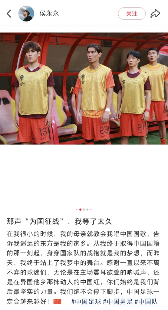 侯永永更新社媒,晒出多张自己身穿国足球衣、训练服的照片,写道:“在我很小的时候,我的母亲就教会我唱中国国歌,告诉我遥远的东方是我的家乡。从我终于取得中国国籍的那一刻起,身穿国家队的战袍就是我的梦想,而昨天,我终于站上了我梦中的舞台。感谢一直以来不离不弃的球迷们,无论是在主场震耳欲聋的呐喊声,还是在异国他乡那抹动人的中国红,你们始终是我们背后最坚实的力量。我们绝不会停下脚步,中国足球一定会越来越好!”