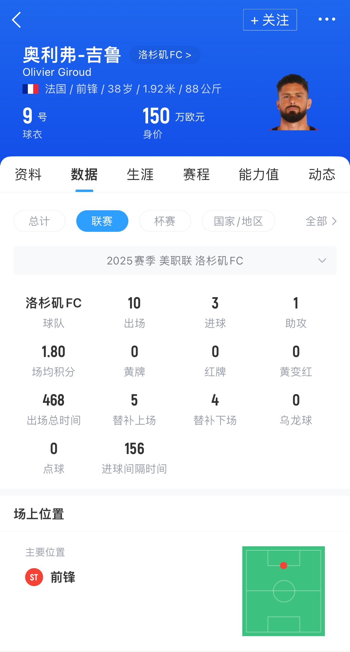 吉鲁是法国队历史最佳射手,137次出场打入57球。24年7月,他从米兰转会至洛杉矶FC,本赛季他为洛杉矶FC出场10次,打入3粒进球并取得1次助攻,目前其德转身价预估150万欧元。