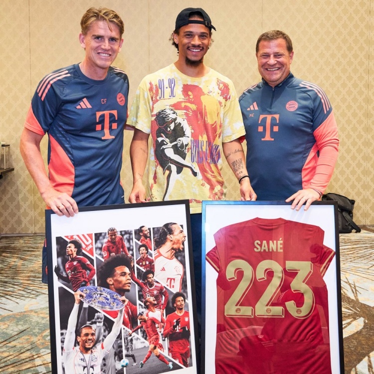 拜仁酒店内为萨内举行告别仪式,向其赠送纪念球衣及特制海报